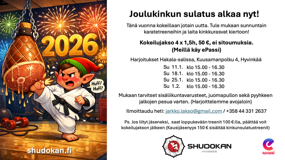 Aikuisten kausimaksu on 150€ ja nuorten (16-18 v.) 75€. Ensimmäisen vyökokeen hinta on 10€. Liikuntaeduista meille käy maksuvälineeksi ePassi.